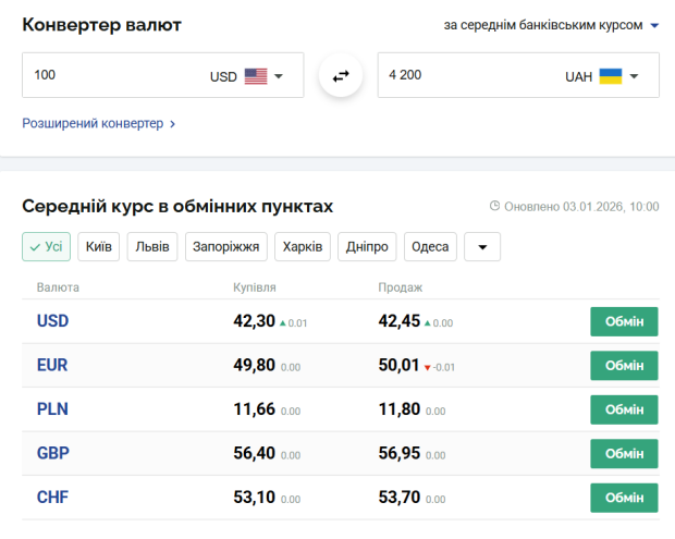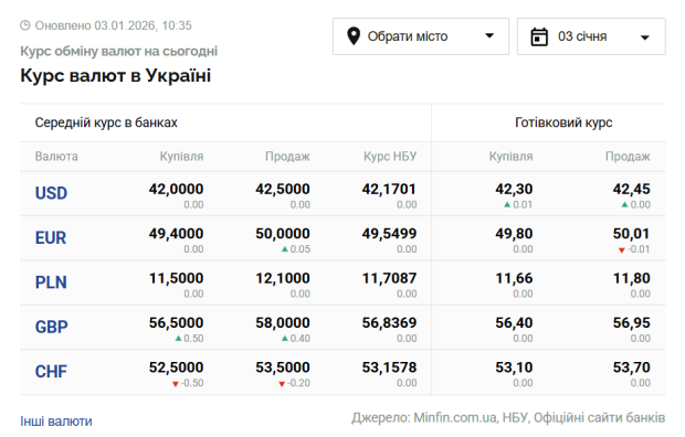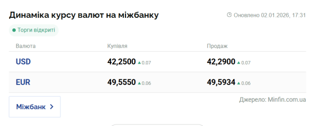 Курс валют в Украине на 3 января 2026 года
