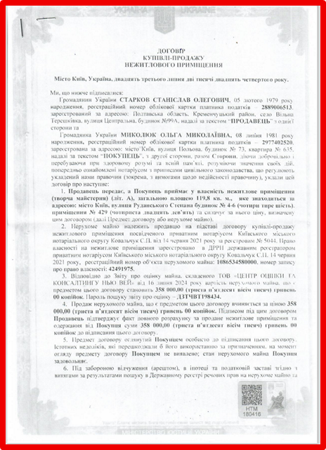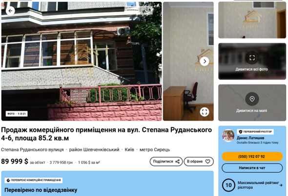 Анализ этих сделок вызывает серьезные вопросы. Ключевым эпизодом является приобретение коммерческого помещения общей площадью 119,8 кв. м по смешной цене 358 000 грн., которое находится по адресу: г. Киев, ул. Степана Руданского № 4-6.