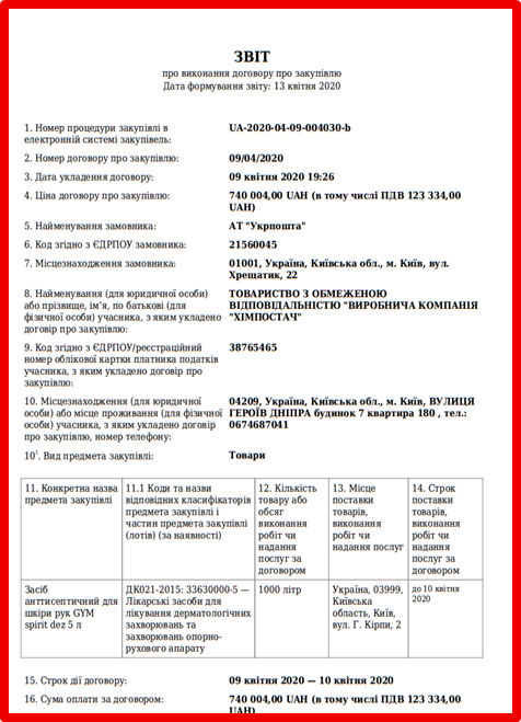 Особливу увагу ми приділили одній закупівлі. Державне підприємство АТ УКРПОШТА придбало у ТОВ «ВК ХІМПОСТАЧ» 1000 літрів антисептика на загальну суму за 740 000 грн. Тобто 740 грн за літр мутної рідини за космічну суму.