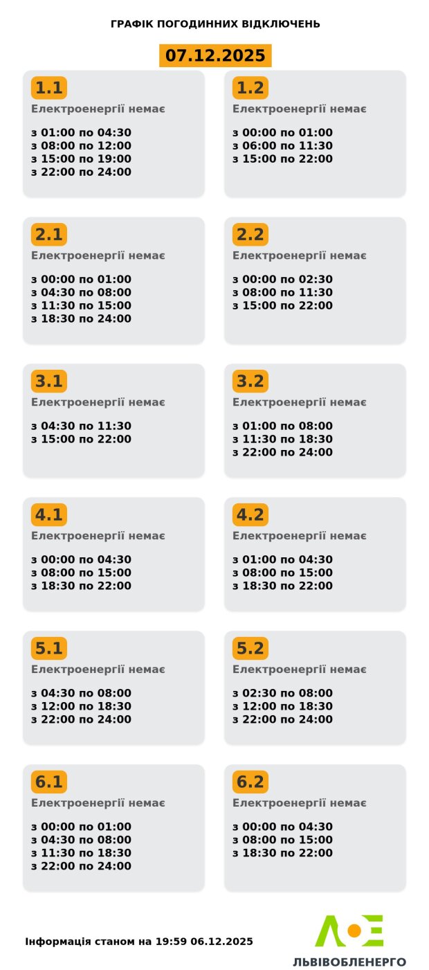 Для мешканців Львова енергетики розповсюдили власний графік погодинних відключень на 7 грудня. Він також буде доданий на фото нижче.