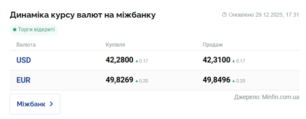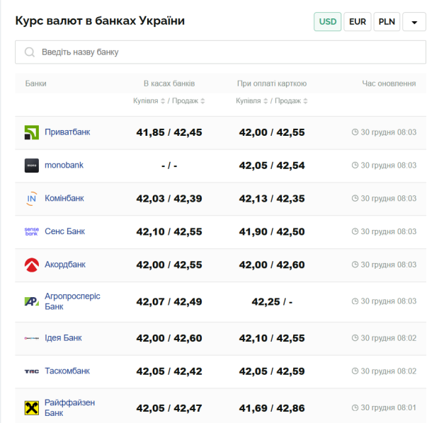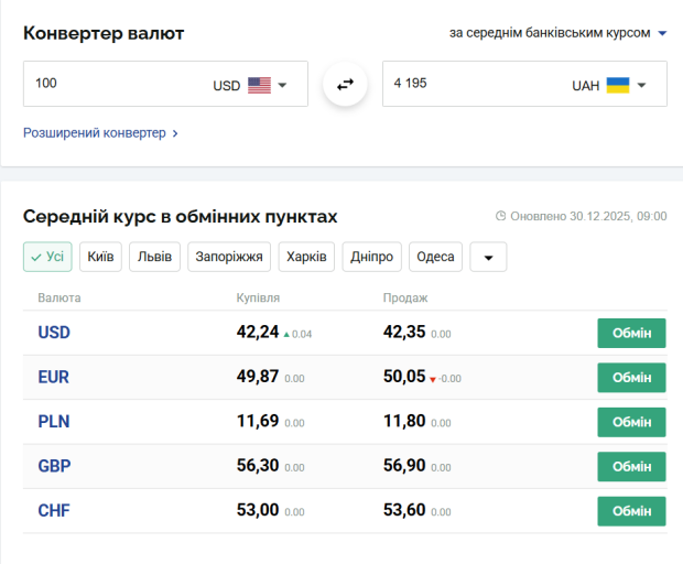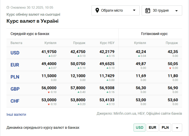 На сьогодні, 30 грудня, курс валют в Україні такий: