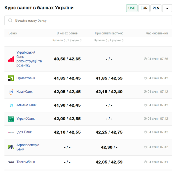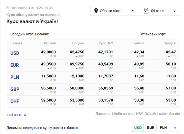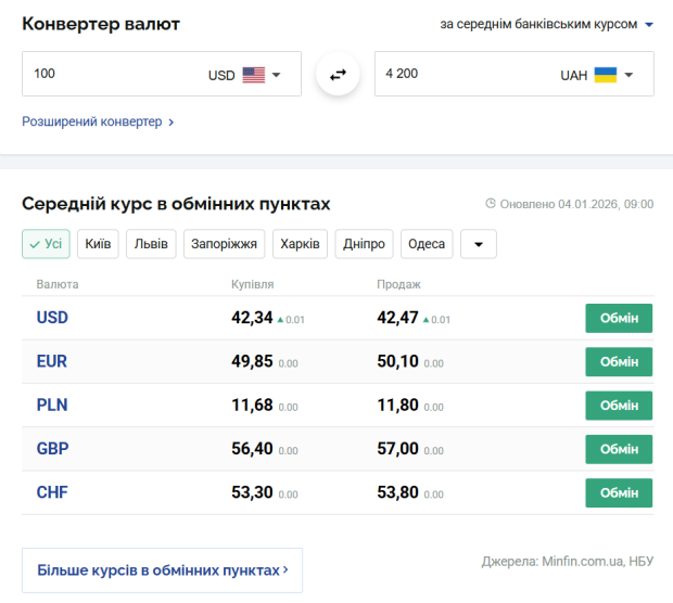 На сьогодні, 4 січня, курс валют в Україні такий:
